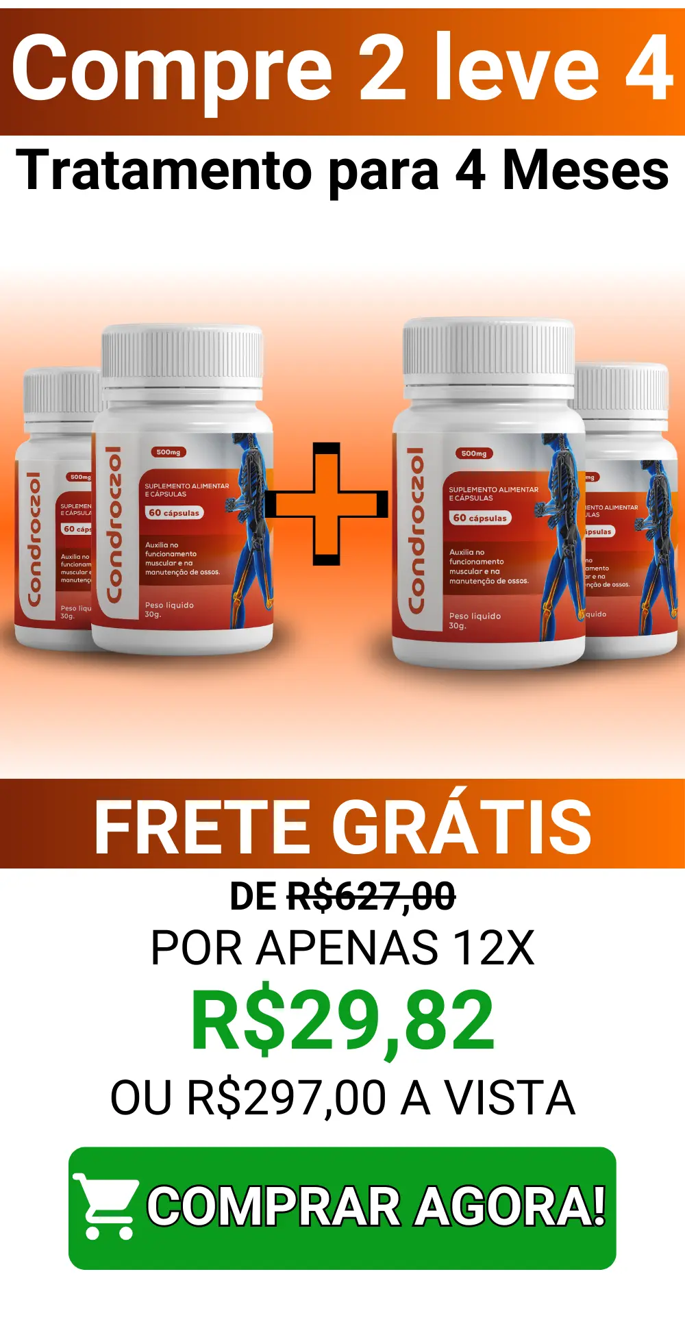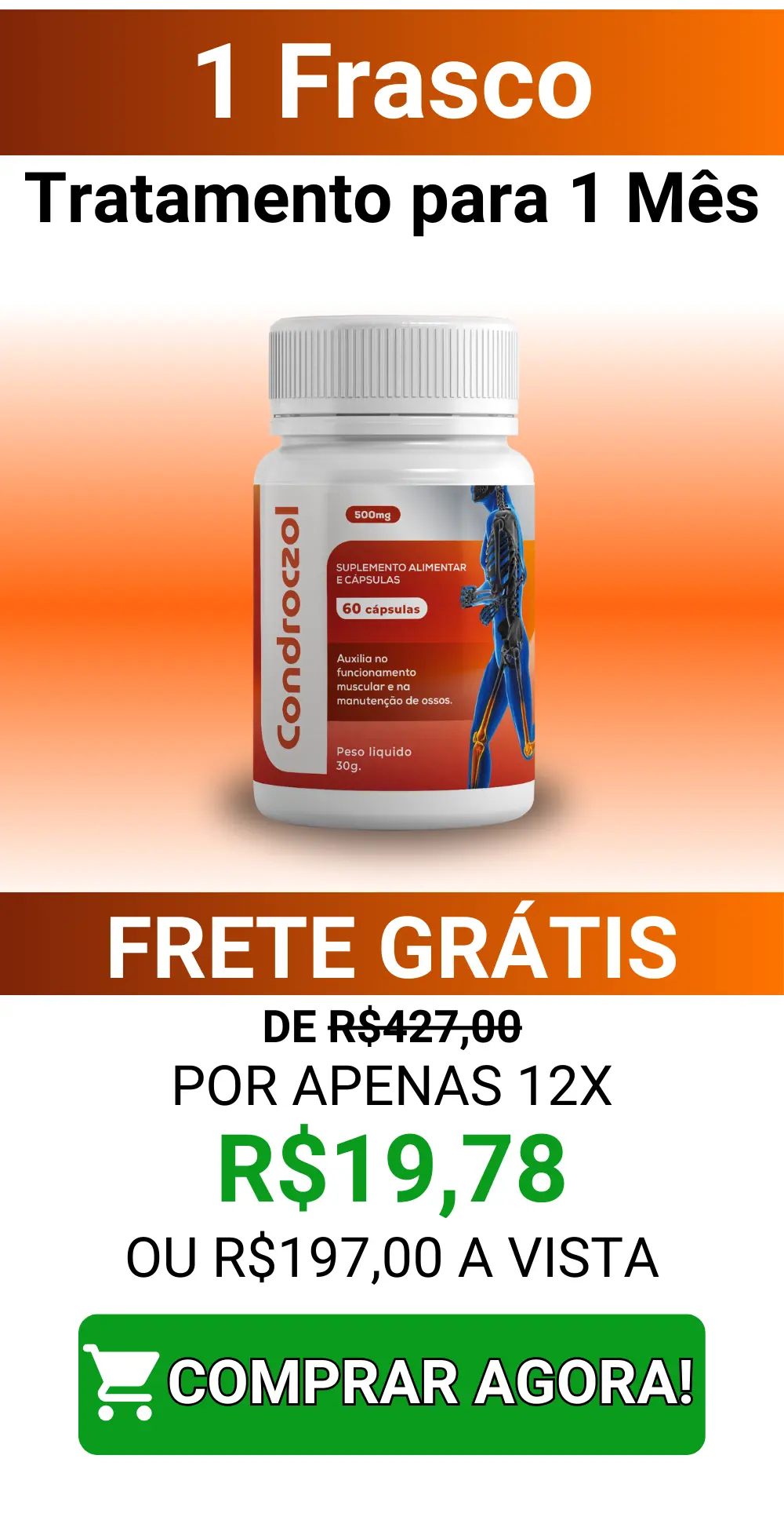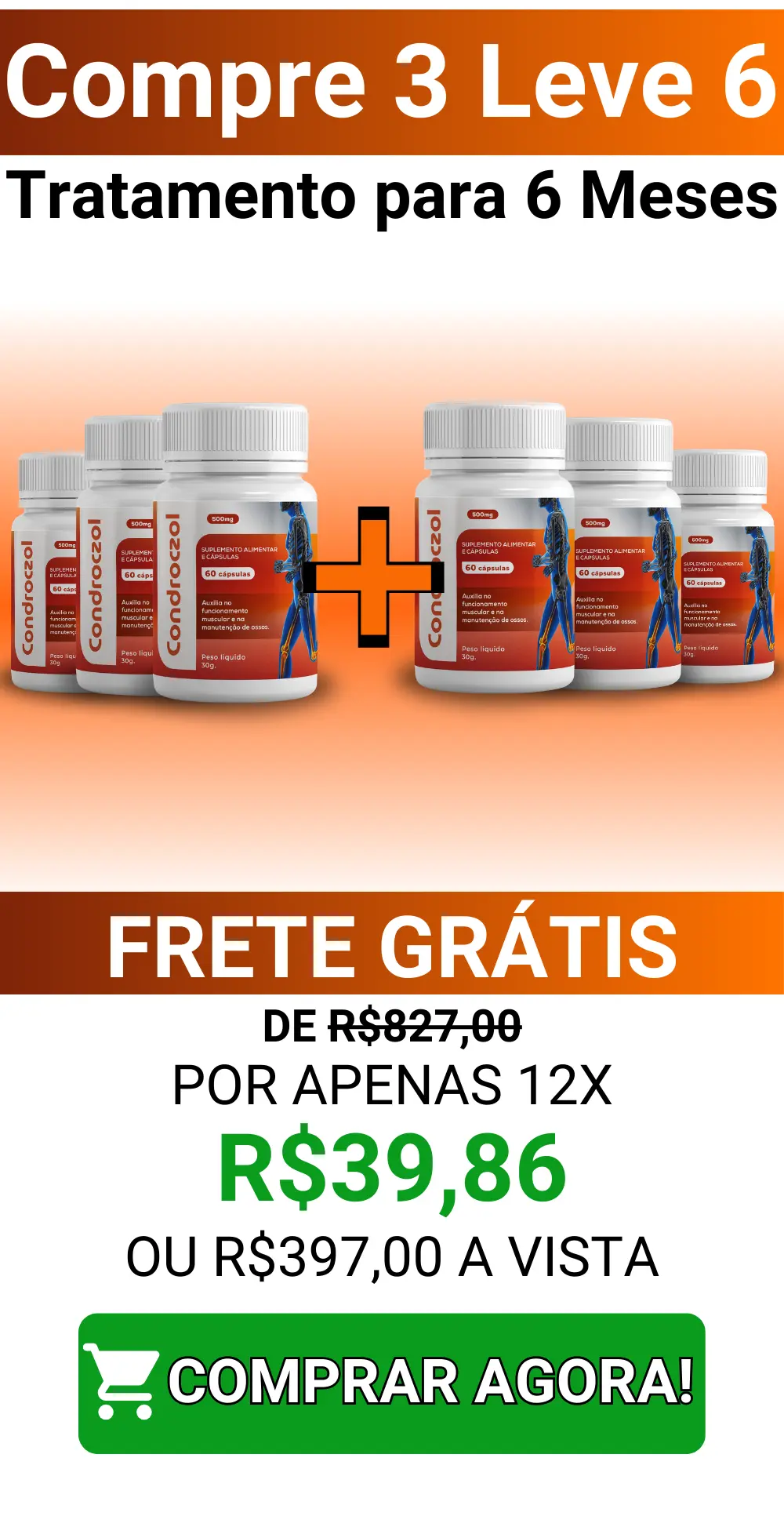 Não conseguimos manter essa promoção por muito tempo, pois os ingredientes do CONDROCZOL são de altíssima qualidade e limitados. Além disso, alguns deles têm custos atrelados ao dólar, o que dificulta a reposição. Por isso, essa oferta especial só vai durar hoje. Assim que você sair dessa página, ela não estará mais disponível.